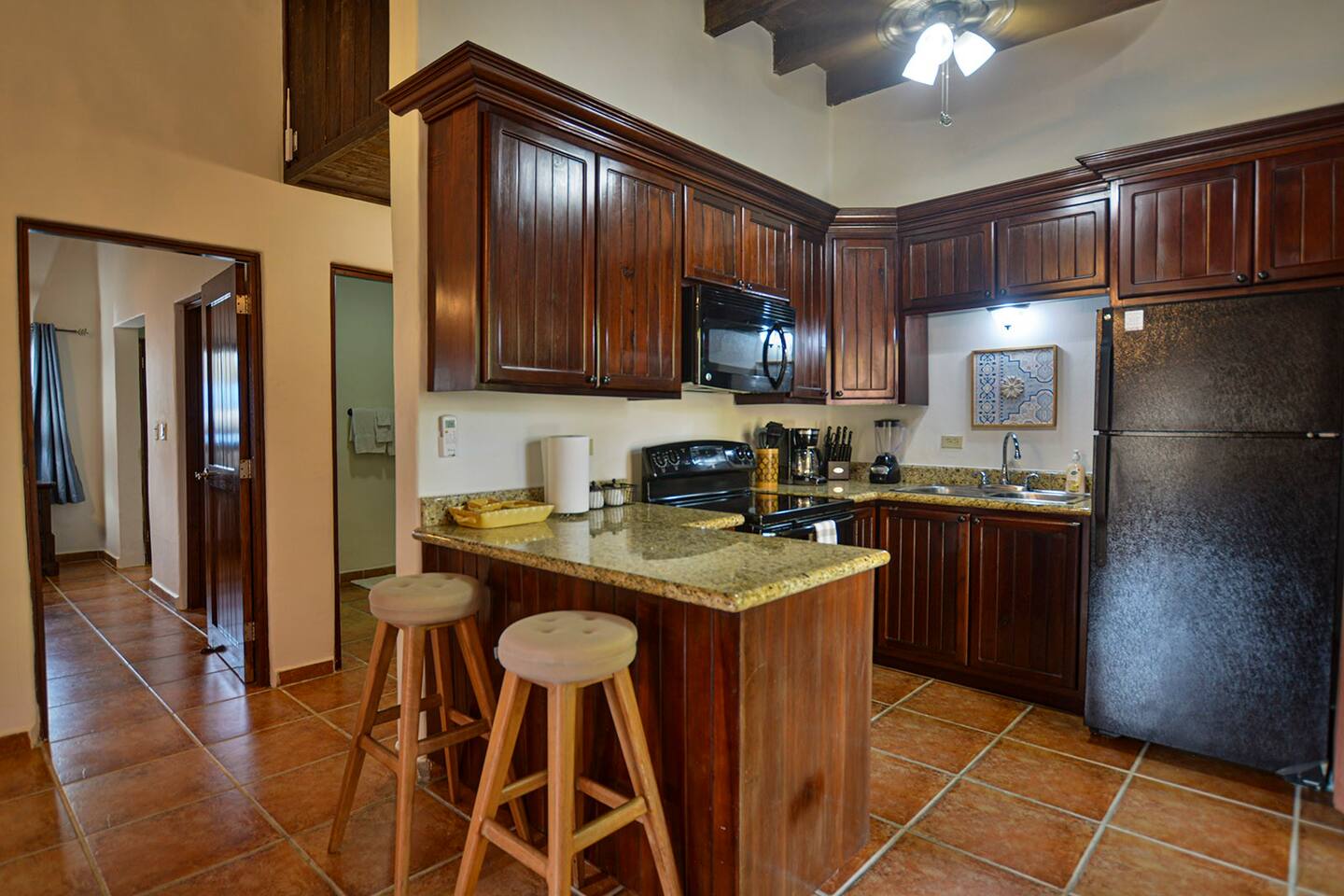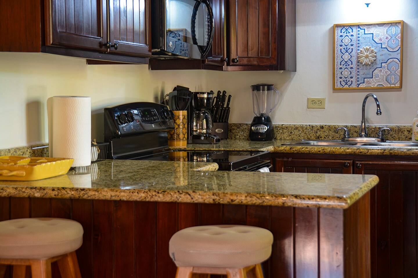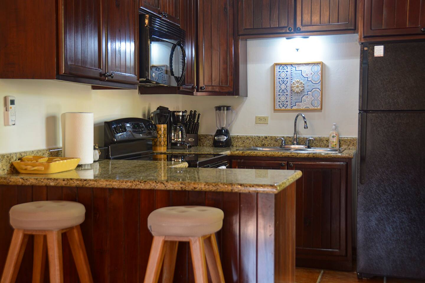 Well appointed kitchen with full size fridge and oven makes cooking meals easy. Plenty of space to relax and dine at home. Don`t want to cook? Just a short stroll away you will find endless choices for dining out along the beach and local area. This condo is in the heart of West Bay, Roatans` most beautiful beach.