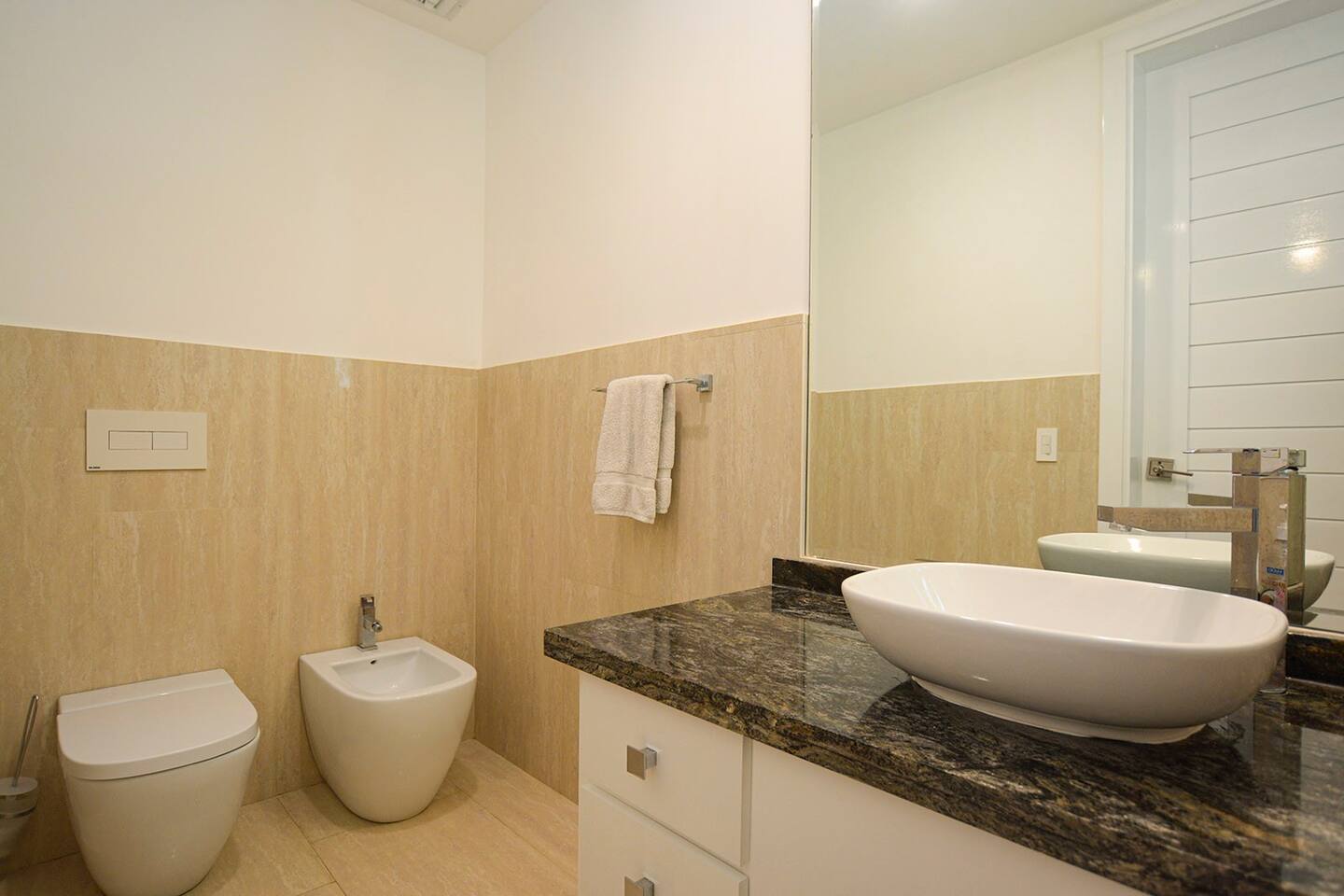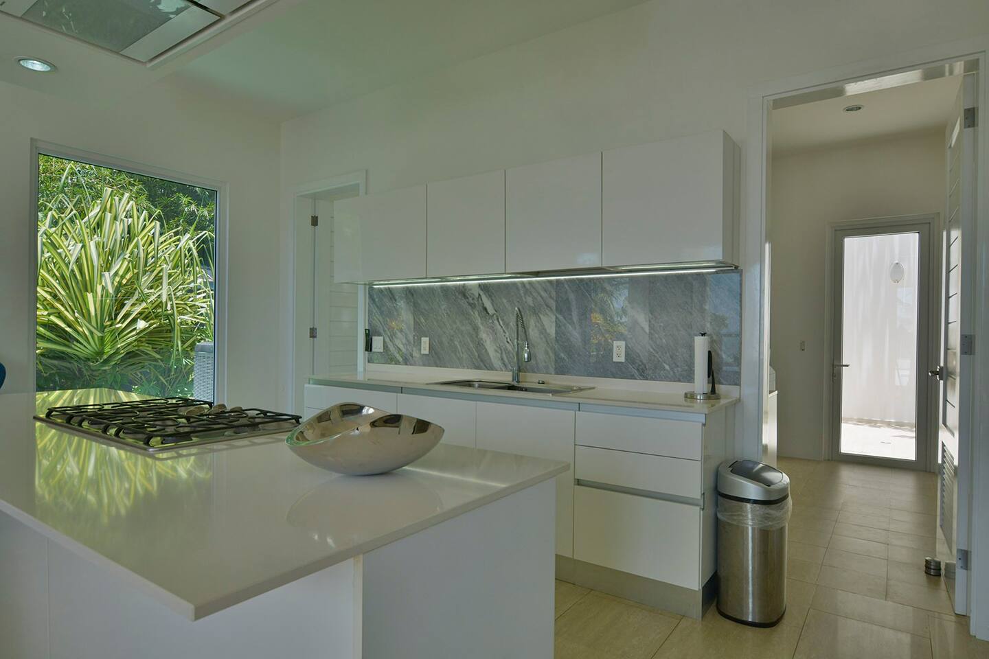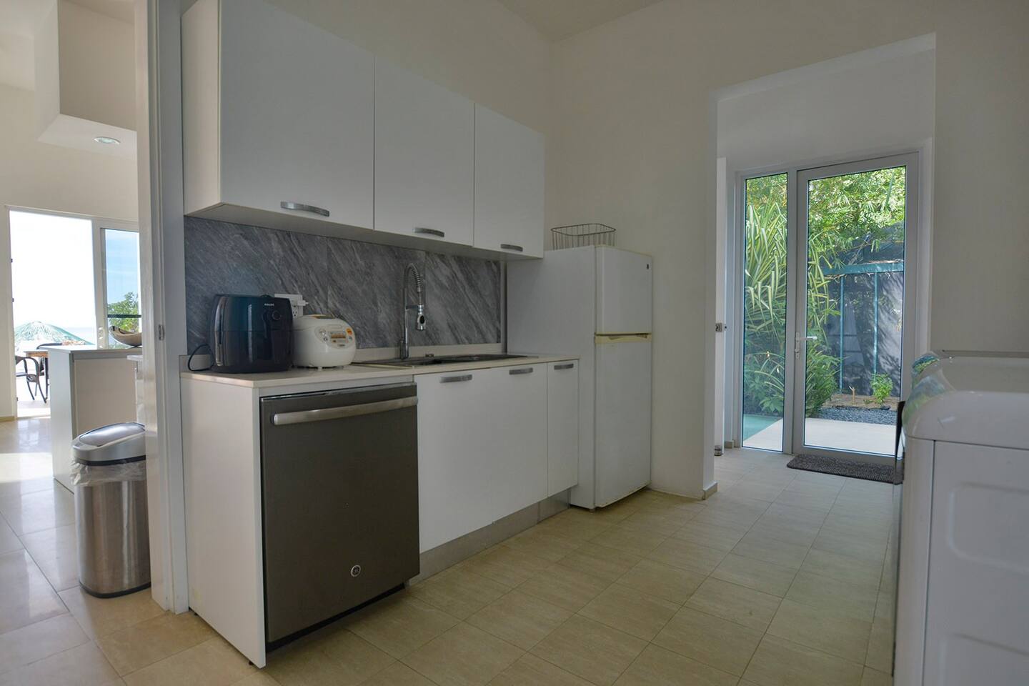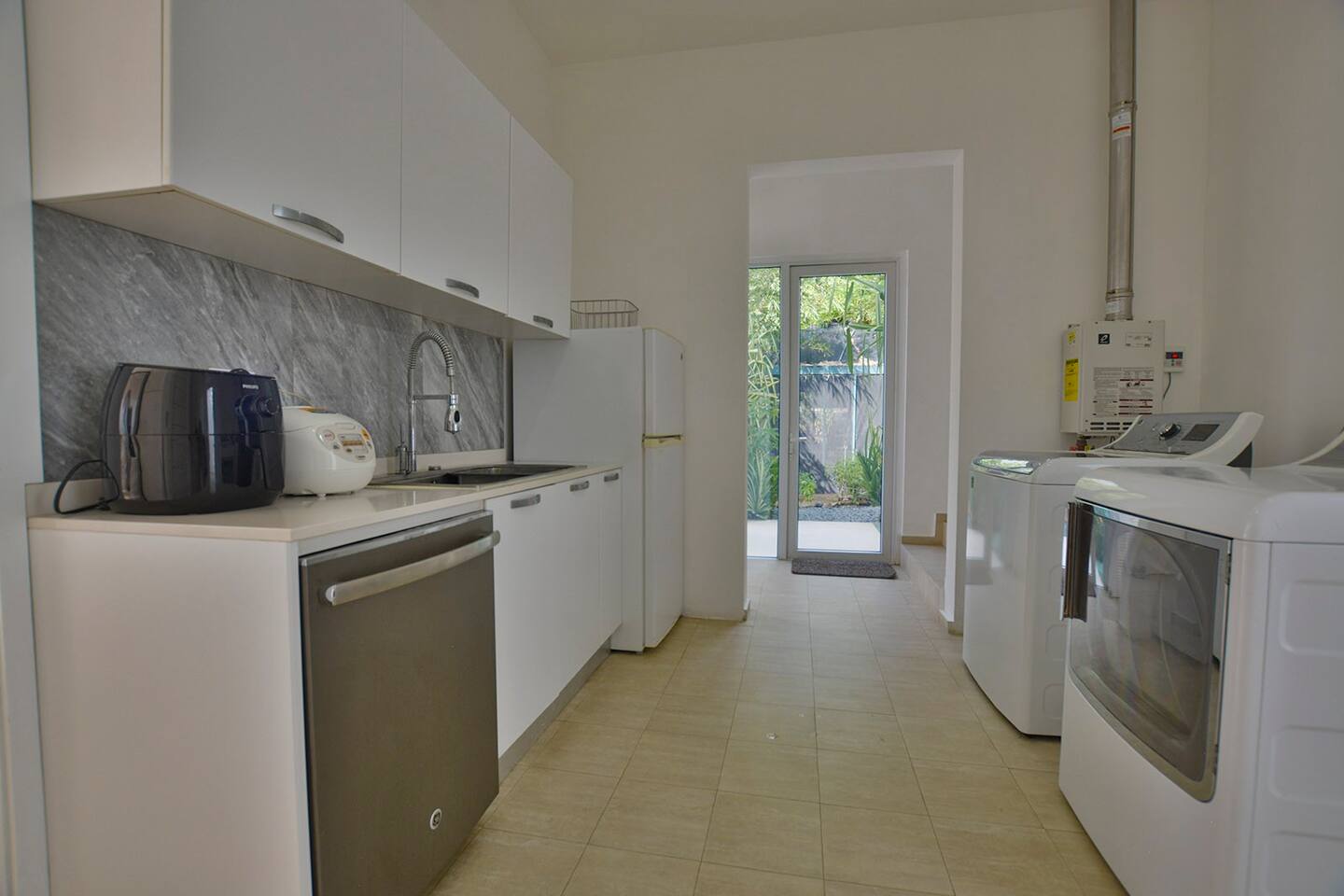 The ground floor open plan living area opens onto the beachfront pool deck. The modern kitchen has an additional pantry area with extra fridge space, extra storage, dishwasher, washer & dryer.