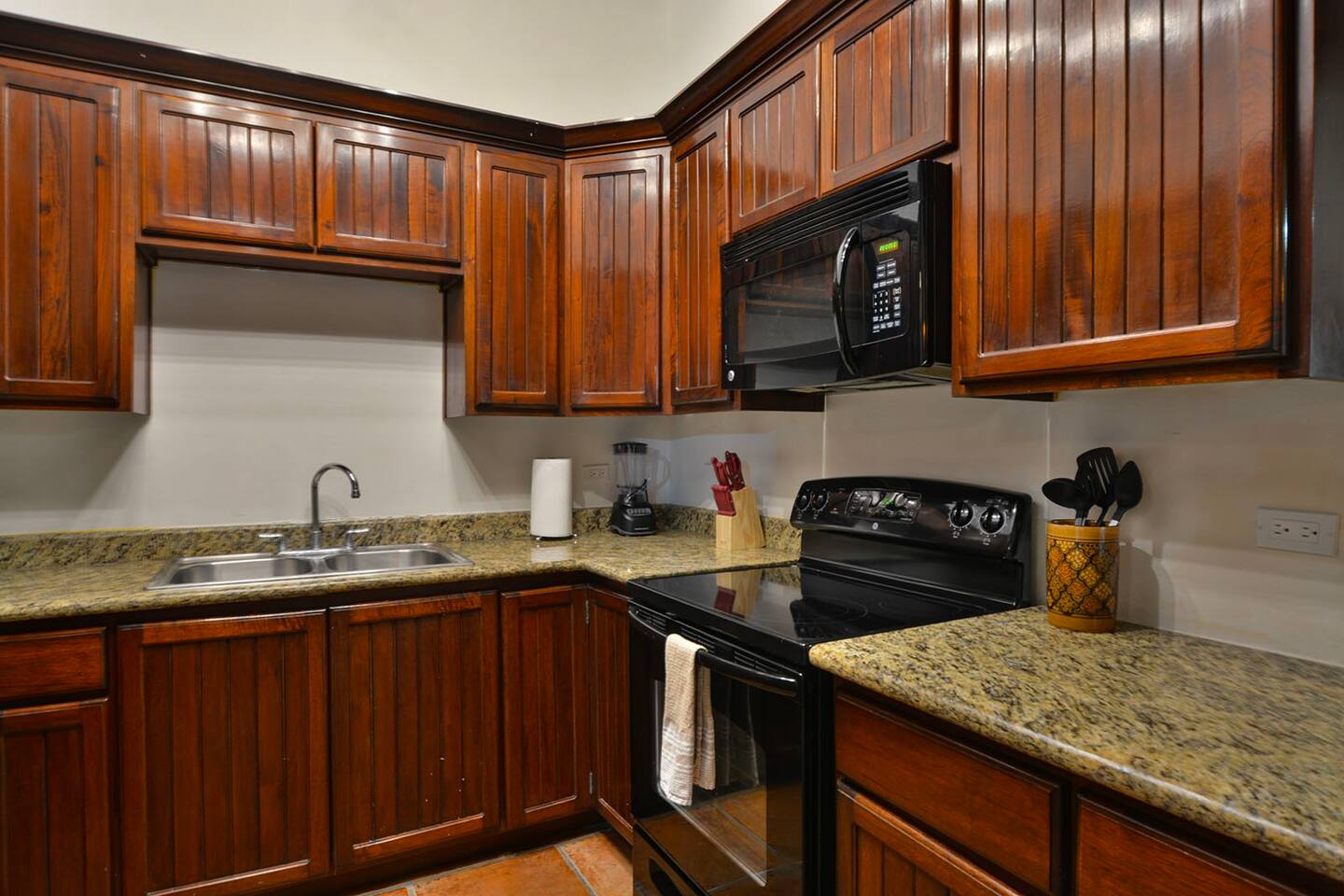 The living space is an air-conditioned, open-concept floor plan with the living room flowing into the dining room and then into the kitchen to allow for more a more spacious experience. The kitchen appliances are all full-sized GE Profile models. The kitchen is also well-stocked for guests looking to cook during their stay. This space is rounded out with a 50” TV and wireless internet throughout the unit. Other amenities include a stack washer and dryer for guest use and a patio with a table and seating for 4.